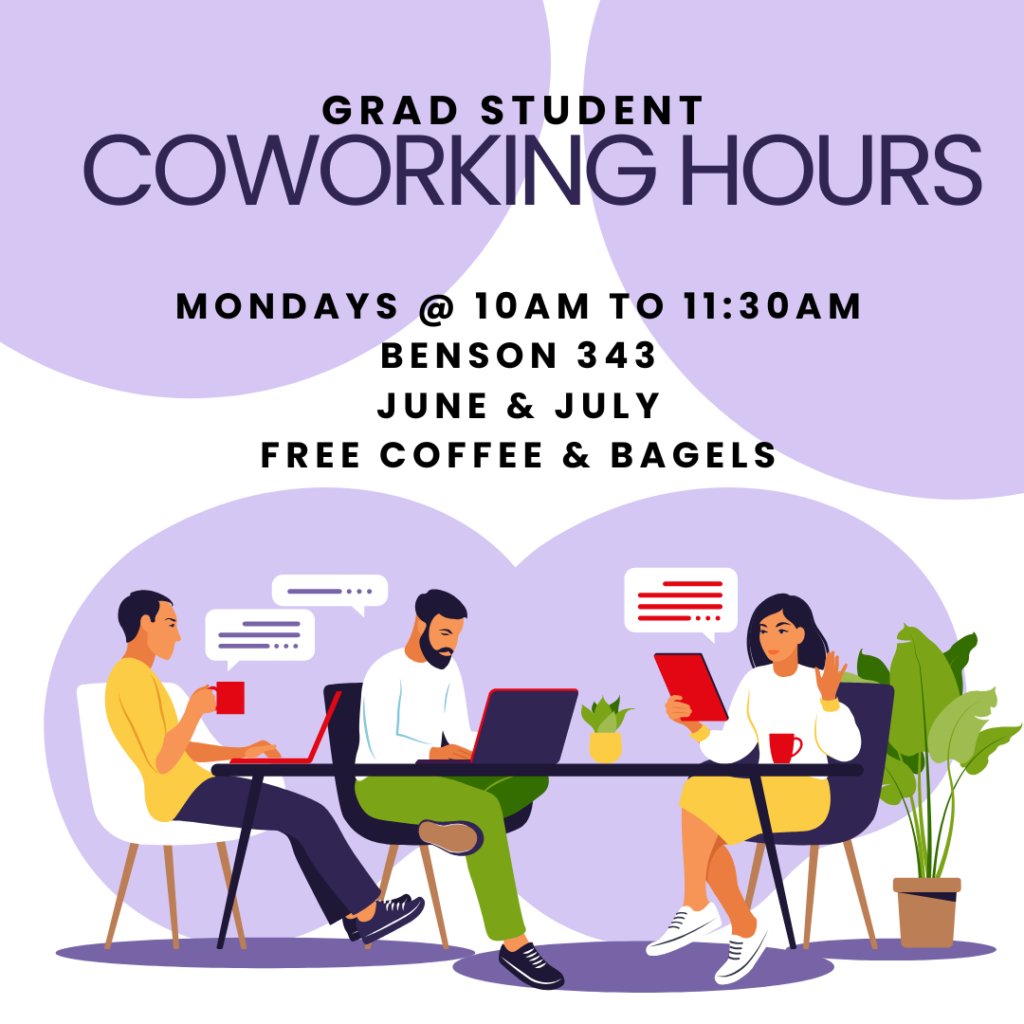 Every Monday @ 10am to 11:30am, Benson 343, beginning June 2nd through July 28th. Find it hard to focus during the summer? Want to kick your week off right? Join us every Monday starting June 2nd for graduate student coworking hours! You bring whatever it is you need to get done, and we’ll bring the free coffee and Bagel Station. See you there!