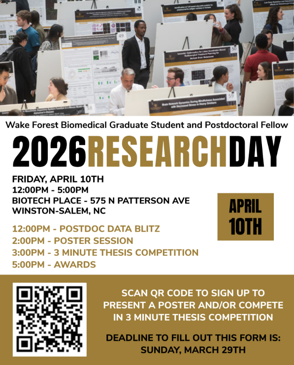 Register by March 29th. Research Day is a special opportunity for our graduate programs to come together as a community to share cutting edge research and advancements in the relevant field of study. This year’s event will be held on Friday, April 10th from 12pm to 5pm at Biotech Place. You may participate in the non-judged poster presentation event, which includes a raffle for all participants; or you may register for the judged 3-Minute Thesis Competition. Learn more about the 3MT competition here, including tips and common mistakes. Register for either event here.