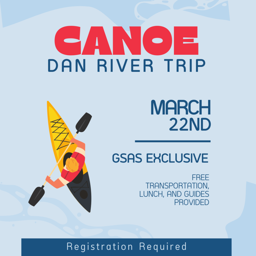 March 22nd. Join the Graduate School of Arts & Sciences and Outdoor Pursuits on this FREE beginner-friendly canoe trip on the Dan River! Exclusively for GSAS students, food and transportation from campus will be provided.  Space is limited, and students will be placed on a waitlist once max capacity is reached. Register here by March 13th.
